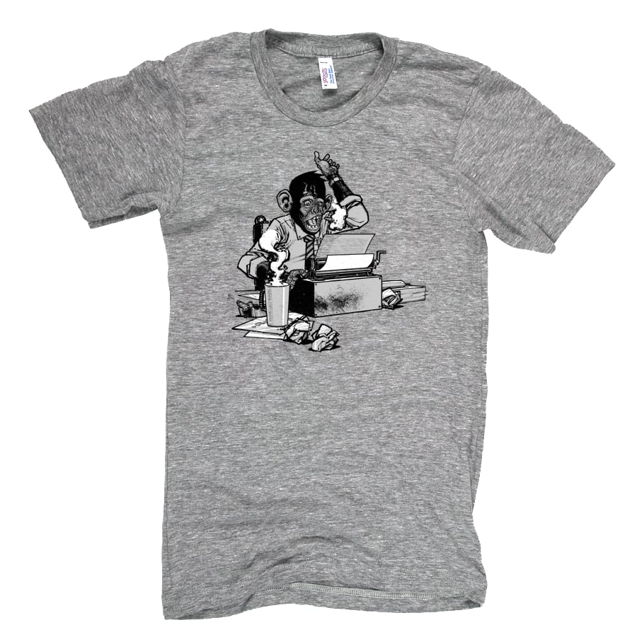 This chimp is hard at work on his latest script. He represents the drive in all of us that exists to create day-in, day-out. Wear this tee as a badge of honor and as a reminder to never stop creating.